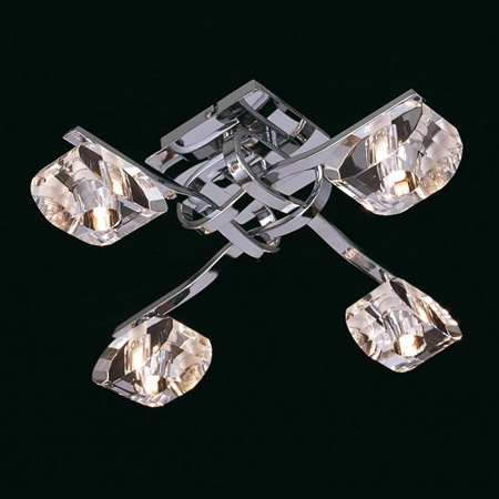 Upeasti muotoiltu 4-osainen plafondimallinen kattovalaisin. Krominvärinen metallirunko, kristallilasi. Espanjalaisen Mantran mallistoa. Valaisin antaa yleisvaloa. Leveys 45cm Korkeus 18cm 4xG9 / 60w max (sisältyy), halogeenit voi korvata myös ledillä. Kiinteä asennus suoraan rasiaan.