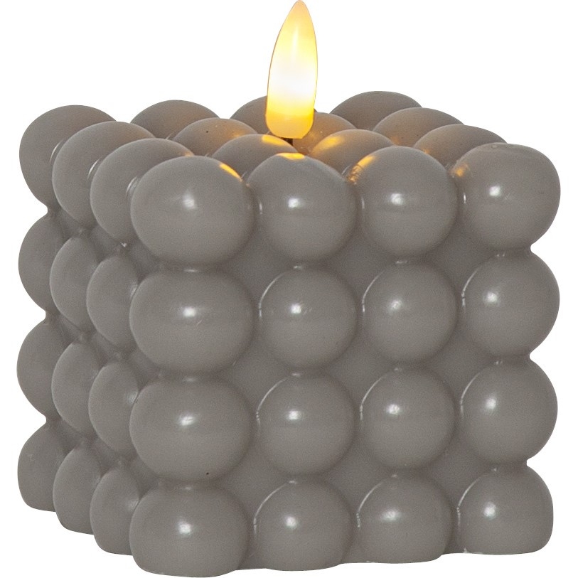 Kynttilänvahasta valmistettu neliskanttinen kuplakynttilä aidon näköisellä LED-liekillä. Harmaa vahakynttilä. Korkeus 9,5 cm Leveys 7,5 cm Aarikkatyylinen led- kynttilä tuo tyylikkäästi tunnelman sisätiloihin. Led-liekin sävy lämmin valkoinen. Paristotarve 2 x AAA-paristolla, eivät sisälly pakkaukseen. Kynttilässä ajastin 6 h päällä, 18 h pois, toistuva.