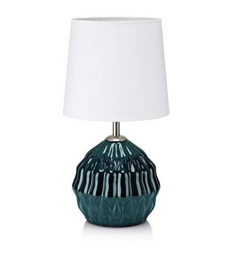 Keraaminen vihertävä jalka ja valkoinen kangaspintainen varjostin.