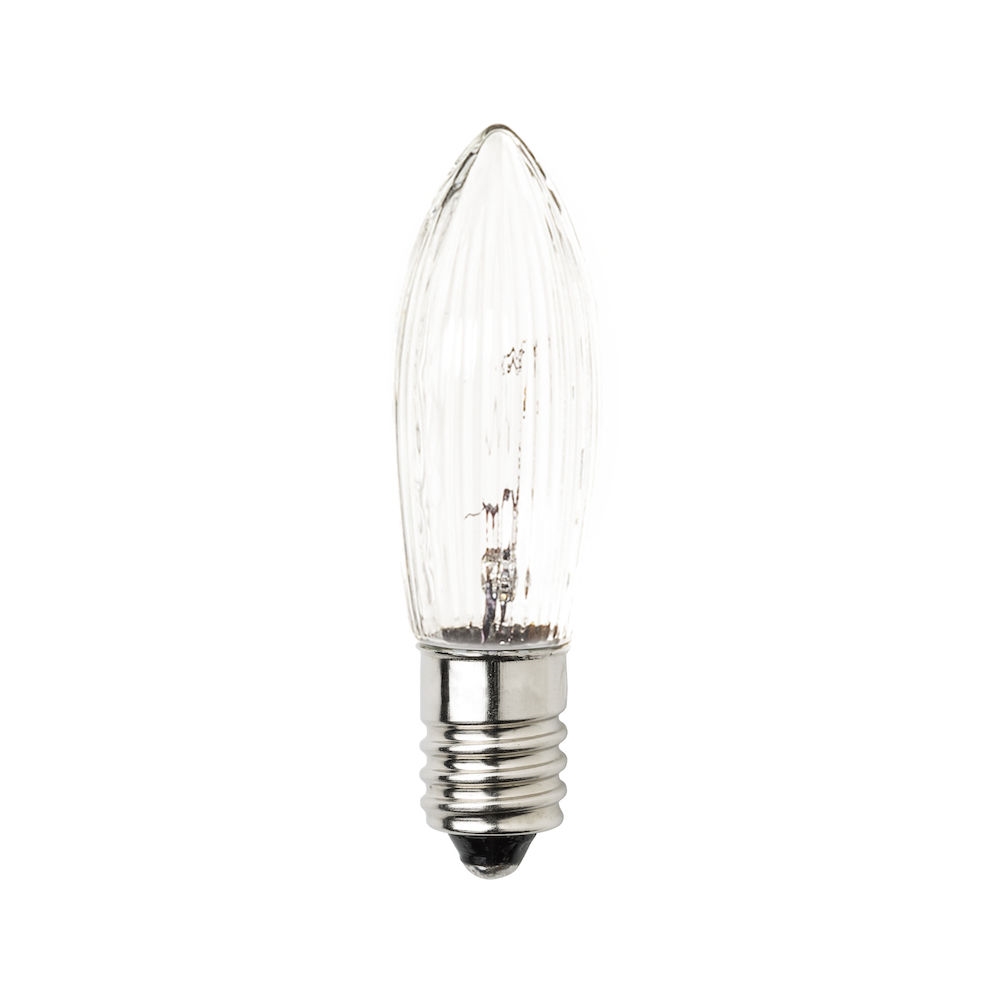 Rihlattu eli viirutetulla lasilla oleva varapoltin 10-osaiseen kynttiläsarjaan tai kynttelikköön. Kanta E10 Jännite 23V Teho 3W 3 kpl lamppuja paketissa