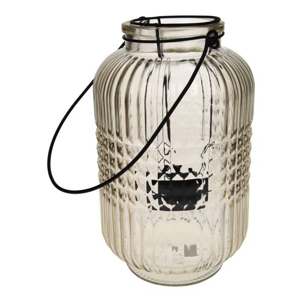 Vanhaa aikaa henkivä lasipurkki saa eloa sisään laitetusta tuikusta tai valosarjasta. Savunvärinen koristelasipurkki, musta ripustussanka ja musta pidike tuikkukynttilälle. Korkeus 24 cm