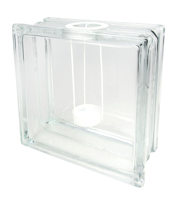 Kirkas lasikuutio, jonka sisällä tuikkukynttilän pidike.