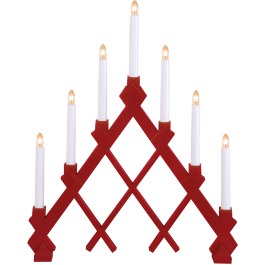 Puinen, punainen ristikkokynttelikkö Rut. Suomalaiseen perinnejouluun hyvin sopiva, tunnelmallinen kynttelikkö. Korkeus 53 cm Leveys 43 cm Syvyys 7 cm 7 x E10 34V 3W, sisältyy. 180 cm pitkä johto, jossa katkaisija.