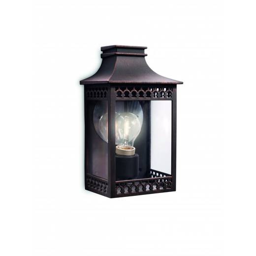 Lämpimän ruskean värinen metallilyhty ulkoseinään, valaisin sopii hyvin myös sisätiloihin. Puolilyhtymallinen seinävalaisin tuo valon hyvin, mutta ei vie tilaa ja sopii näin hyvin terasseille, parvekkeelle, käytävälle... Ruskea alumiinirunko, akryyli-ikkunat. Korkeus 30,7 cm Leveys 17,8 cm Syvyys 13,6 cm 1 x E27 max 60W, ei sis. Kiinteä asennus.