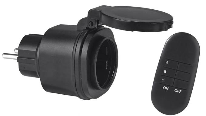 Kaukosäätimellä ohjattava pistorasia ulkokäyttöön.