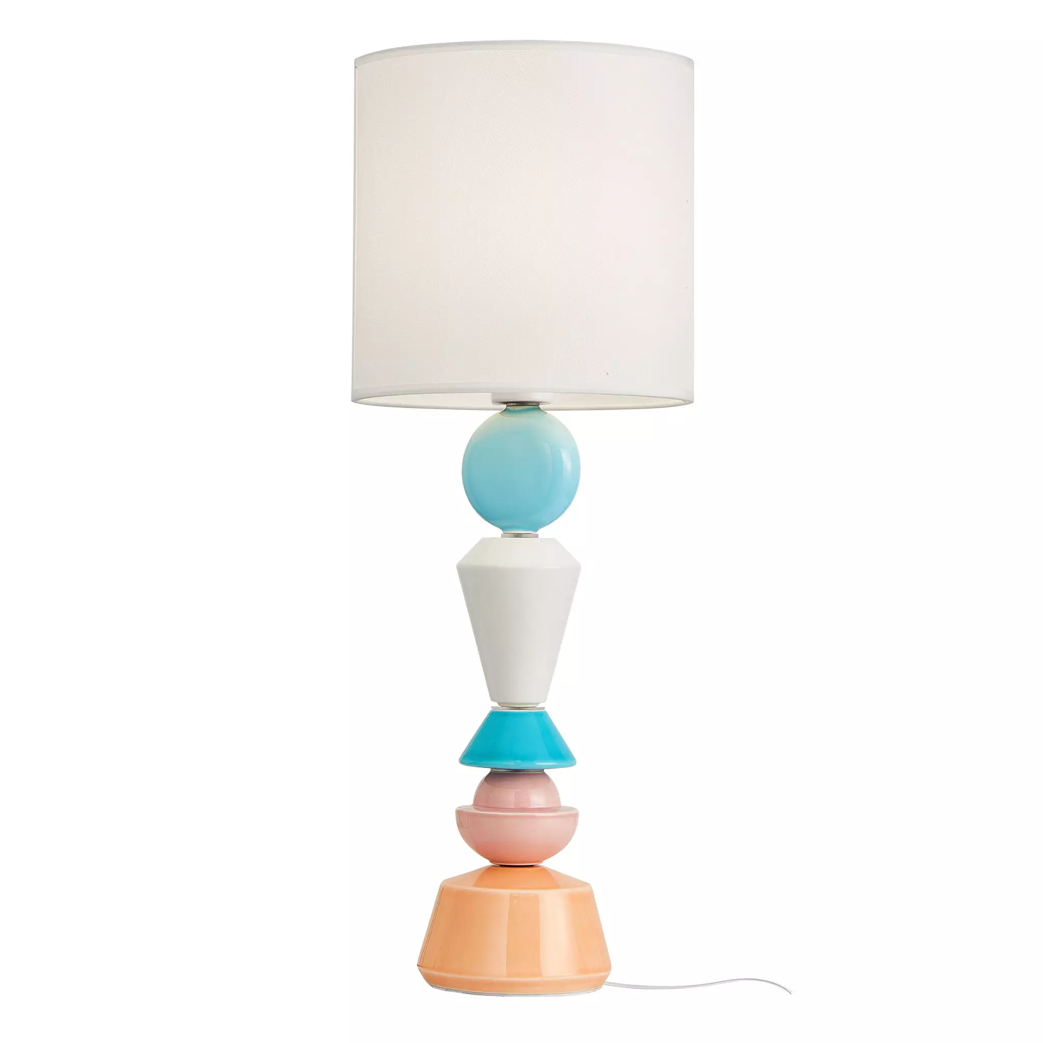 Näyttävä Play pöytävalaisin toimii katseenvangitsijana tilassa. Keraaminen, monivärinen jalka ja valkoinen kangaspintainen varjostin. Korkeus 65 cm Varjostimen halkaisija 35 cm Varjostimen korkeus 25 cm 1 x E27 max 40W, ei sisälly. Katkaisija johdossa.