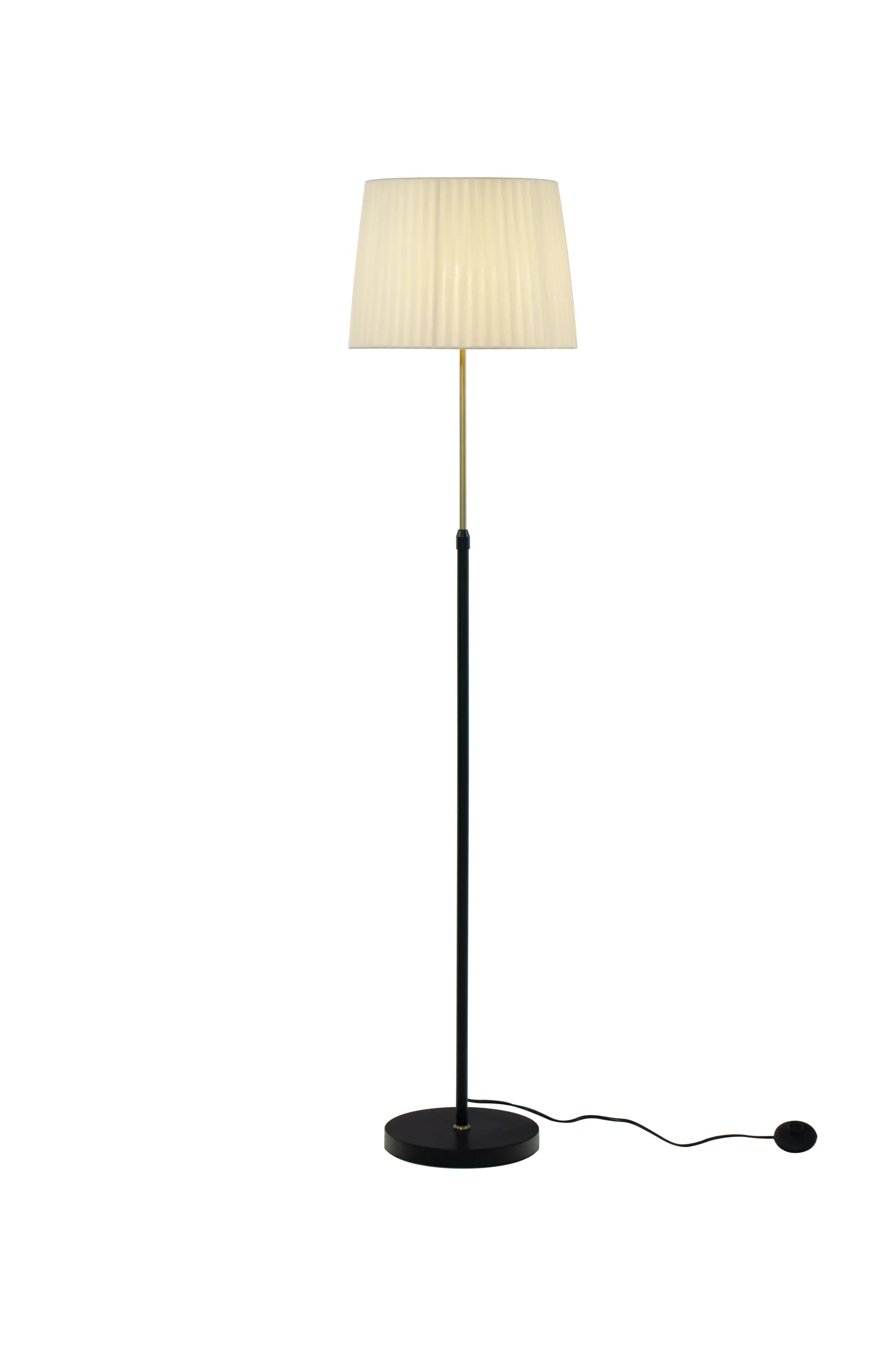 Klassinen ja ajaton Ezai- lattiavalaisin kangasvarjostimella. Musta metallijalka messinkisomistein ja luonnonvalkoinen, pliseerattu kangasvarjostin. Jalan korkeutta voi säätää. Kytkin johdossa lattialla. Korkeus 125 - 165 cm Halkaisija 36,5 cm 1 x E27 max 40W, ei sisällä valonlähdettä.