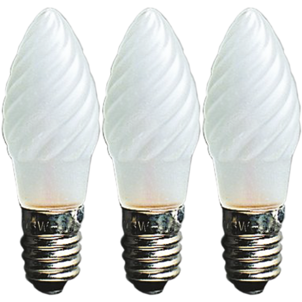 E10 kantainen varalamppu, jossa lasikupu on huurrelasinen ja kierteellinen. Pakkauksessa on 3 kpl varalamppuja. Varalamppu käy esim. StarTradingin 20 lamppuiseen jouluvalosarjaan. Halkaisija 1,5 cm Korkeus 4,5 cm Kanta E10 Jännite 12V Teho 3W
