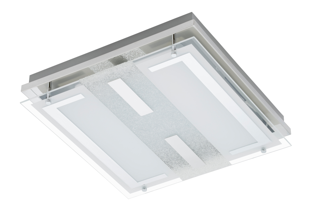 Moderni, neliönmuotoinen plafondi, jonka saa palamaan kolmella eri teholla tavallisella katkaisijalla. Krominvärinen metallipohja ja lasilevy on matta harmaa kromisilla somisteilla. Leveys 32 cm...