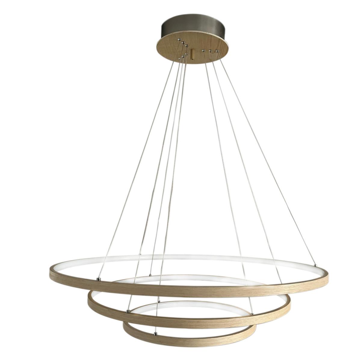 Lämmin, luonnonvärinen puu renkaissa pehmentää tyylikästä, modernia valaisinta.