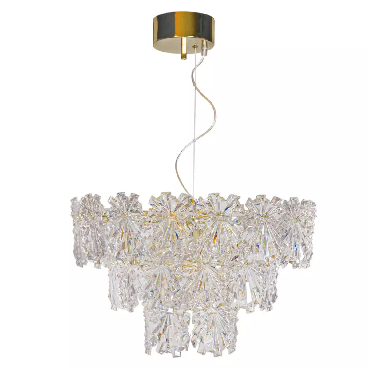 Messinginvärinen metallirunko tuo lämpöä ja jääkiteen muotoiset akryylikoristeet taittavat valon kauniisti