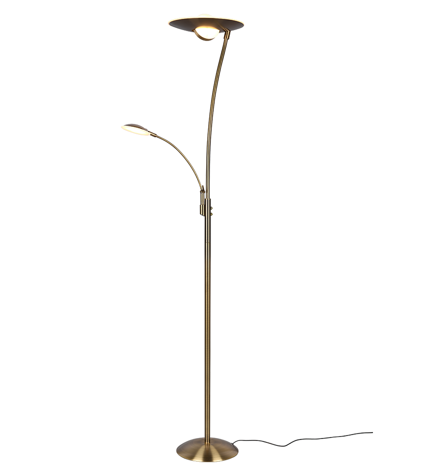 Moderni lattiaylösvalo Granby tuo valon tehokkaasti tilaan. Ylöspäin valaiseva led-valo tuo tasaisen yleisvalon epäsuorasti eli häikäisemättä ja valaisimen varressa oleva lukuvalo antaa tarvittaessa suoran, tehokkaan lisävalon. Tyylikäs valinta olohuoneeseen tai työhuoneeseen. Molemmille valoille on oma katkaisija ja katkaisijasta voi valita kolmesta värisävystä (2700K/3200K/4000K) sekä himmentää portaattomasti. Ylösvalo 1 x SMD LED 29W · max 3400lm, 2700+3200+4000K Alavalo 1 x SMD LED 6,5W · max 650lm, 2700+3200+4000K Himmenninkatkaisijat ovat keskellä valaisimen varressa. Valaisimessa on muistitoiminto, valo syttyy edellisen kerran jätettyyn valintaan. Antiikkimessinginvärinen metallirunko.