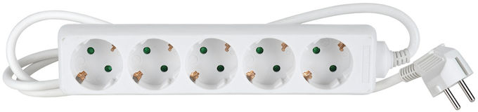 5-osainen maadoitettu jatkojohto. Johdon pituus 1,5m. Pistokkeet 45 asteen kulmassa.
