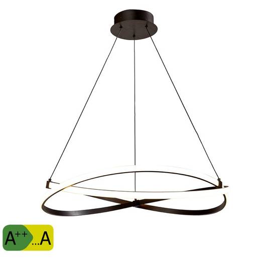 Moderni ja ilmava led-riippuvalaisin. Design Jose I. Ballester Metalliosat tumman ruskeat ja ledien päällä valkoinen akryyli. Halkaisija 51 cm Valo-osan korkeus 10 cm Korkeus 40 - 150 cm, vaijerien pituutta voi säätää. Kiinteä 42W led Valon värilämpötila 2800K, lämmin valkoinen. valon määrä 3400 lumen, vastaa reilua 300W hehkulampputehoa. Kiinteä asennus.