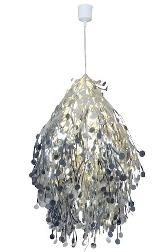 Hopean värinen riippuvalaisin Korkeus 80cm Halkaisija 45cm Valaisin on koottava Hopean värisistä muoviliuskoista koostuva valaisin. Käy koukku- ja pistotulppakiinnitykseen, pistotulppa ei sisälly. 1xE27 max 40W (ei sisälly), kaikki lampputyypit käyvät tähän valaisimeen.