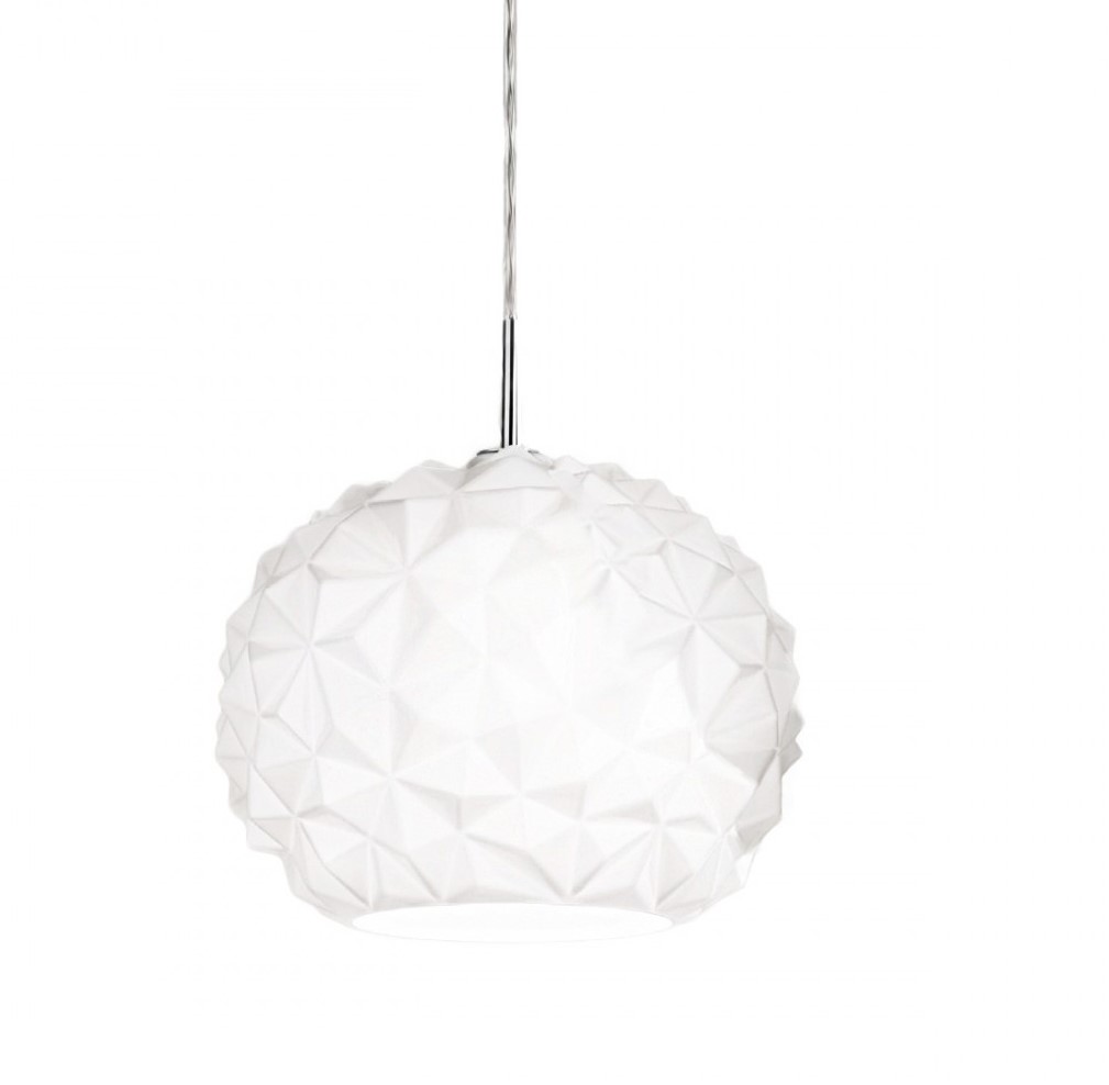 Kaunis ja näyttävä lasiriippuvalaisin Meteora. Kulmikkaasti muotoiltu lasikupu laskee valon kauniisti ympärilleen. Kiiltävä valkoinen lasikupu, metalliosat krominväriset. Halkaisija 35 cm Lasikuvun korkeus 30 cm Korkeus max 150 cm 1 x E27 max 60W, ei sisälly. Kiinteä asennus. Lisävarusteena voi ostaa valkoisen, muovisen kattokupin, jolloin asennus käy myös koukkuun ja tarvittaessa pistotulppaan.