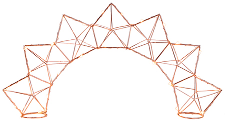 Kaunis ja ilmava kaarimallinen pöytäkoriste. Ledien johto on ohut ja huomaamaton, joka on sävy sävyyn kuparinvärisen metallikaaren kanssa. 25 kpl lämminvalkoista lediä, ei vaihdettavissa. Pituus 52cm Korkeus 26cm Syvyys 7cm Sisäkäyttöön. Johto 3 m, jonka päässä muuntaja. Kokonaiskulutus 0.75W