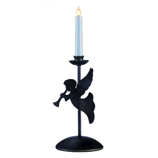 Kaunis 1-osainen kynttilänjalka. Antiikkimusta metalli. Halkaisija 12cm Korkeus 36cm Katkaisimellinen johto, muuntaja 12V. 1xE5 12V 1W (sisältyy), tuotteen omaa varalamppua ei valitettavasti enää saa, mutta tilalle käy E5 kantainen 12V pienikupuinen poltin. Varapoltin on vain huomattavasti pienempi kokoinen kuin alkuperäinen liekin muotoinen.