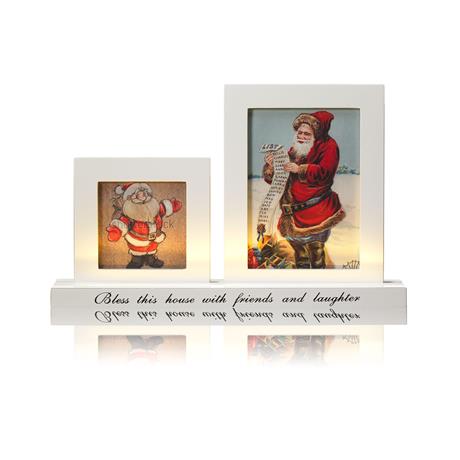 Puinen, valaistu valokuvakehysteline pöydälle. Kehysten edessä led-valonauha, valaisee kuvat kauniisti. Teksti: Bless this house with friends and laughter. (Siunaa tämä koti ystävillä ja naurulla) Valkoinen puu Lämminvalkoinen led 1,44W Liitosjohdon pituus 2m, johdossa katkaisija. Pituus 37cm Leveys 7cm Korkeus 23cm Muuntaja 12V 4,8VA