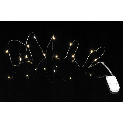 hopeanvärinen johto, lämminvalkoiset ledit, valkoinen paristokotelo.
