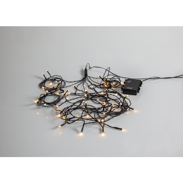 Paristokäyttöinen led- sarja muodostuu kahdeksasta rimpsusta, joten sarja käy hyvin aurinkovarjon alle tai matalan puun, koristepensaan päälle. Sarjassa on 8kpl 140cm pituisia led-nauhoja, jokaisessa nauhassa 8kpl lämmin valkoista lediä. Sarjaa voi käyttää kesäaikaan aurinkovarjon alla ja talvella sarja käy vaikka joulukuusen valoksi. Musta johto. Paristokotelon ja led-sarjan väli 2 m. Yhteensä 64 kpl ledejä. Paristotarve 3 x AA, ei sisälly. Paloaika yhdellä paristokerralla noin 120h. Sarjassa ajastin, joka toistaa toimintoa 6h päällä, 18h pois päältä. Ledien väli 17 cm Kotelointiluokka IP44