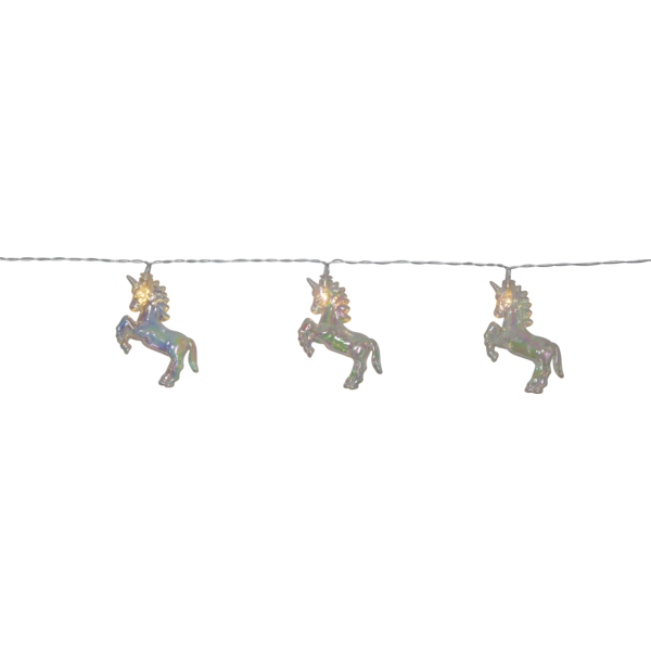 Kaunis yksisarvinen valosarja kaunistaa kotia ja sisustusta, sopii myös lastenhuoneisiin yövaloksi. Paristokäyttöinen sarja on helppo sijoittaa eri paikkoihin sisätiloissa. 10 kpl lämminvalkoista lediä/hevoskoristetta. Paristotarve 2 x AA, ei sisälly. Paloaika yhdellä paristokerralla noin 60h. Paristokotelossa ajastin, joka toistaa toimintoa 6h päällä ja 18h pois päältä. Sarjan pituus 135 cm Koristeen korkeus 9 cm Koristeen leveys 2,5 cm