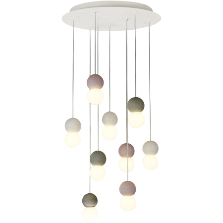 Moderni ryhmävalaisin, joka täydentää kauniisti korkeaakin tilaa. Samasta asennuslevystä riippuu 9 ripustusjohtoa, jotka voi asetella haluttuun korkeuteen. Valkoinen metallilevy, lampun kantapallot metallia. Kantapalloissa kolmea väriä: roosa, harmaa ja valkoinen. Led-poltin on halkaisijaltaan 95mm ja opaalilpintainen, lamppu muodostaa olennaisen osan valaisimen ulkonäköä. 9 x E27, sisältää 6,5W ledit. Led 6,5W E27 3000K 720lumen, himmennettävä. Halkaisija 60 cm Korkeus 21 - 321 cm. Kiinteä asennus.