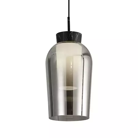 Tyylikäs ja näyttävä Nora riippuvalaisin. Nora - valaisinsarjan mAntralle on suunnitellut José Ignacio Ballester. Savukromin värinen lasikupu on ilman valoa peilimäinen ja tulee läpikuultavammaksi kun valaisimeen laitetaan valo päälle ja sisällä oleva valkoinen lasikupu estää häikäsyn vaikka lamppu olisikin tehokas. Mustan marmorinvärinen somiste ja musta kangaspintainen johto. Korkeus max 180 cm Halkaisija 18 cm Valo-osan korkeus 38,7 cm 1 x E27 max 20W, ei sisälly. Valaisimen mukana tulee kiinteään asennukseen sopiva kattoasennusosa. Jos valaisimen haluaa koukku- ja pistotulppakiinnitykseen, voi lisätarvikkeista ostaa kattokupin ja valaisinpistotulpan, jolloin valaisimen saa käymään koukkukiinnitykseen.