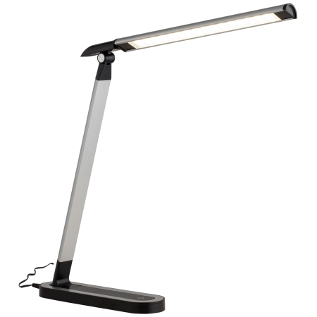 Moderni Chic- pöytävalaisin antaa tasaisen valon työpöydälle. Alumiininvärinen metallirunko, mustilla somisteilla. Korkeus 41 - 71 cm Leveys 6,5 cm Syvyys 38 cm Kiinteä LED 7,5W, maksimissaan 400lumen, jalustassa olevasta katkaisijasta saa valon palamaan kolmella eri teholla. Valon värilämpötila 4000K Valon avautumiskulma 100° Johdon pituus 150 cm