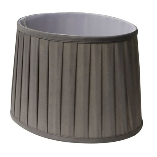 Ovaalin muotoinen Venice-kangasvarjostin. Harmaa, vekattu puuvillakangas. Alareuna 30/22cm Korkeus 21cm Kiinnitys suoraan E27 kantaan varjostimessa olevalla kiinteällä telineellä.