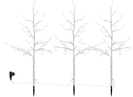 Kolmen valkoisen koivun sarja sisäkäyttöön tai ulos, jos ovat sateelta suojassa. Sopii hyvin esimerkiksi terasseille, parvekkeelle ym. Koivuissa piikkit, joilla ne voidaan painaa ruukkuihin tai maahan. Koivujen osalta johdon pituus 200cm Korkeus 75cm Koivujen väli 100cm Koivun halkaisija 45cm Sisäkäyttöön tai sateelta suojassa ulkotilaan IP44. Kokonaiskuluts 3.6W Syöttöjohto 320cm, jonka päässä 24V DC, IP44 muuntaja. 48 kpl ei-vaihdettavaa lediä.
