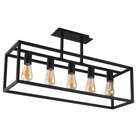 Trendikäs kattovalaisin valaisemaan tai tuomaan tunnelmaa. Musta metallikehyksinen valaisin sopii hyvin pöydän tai tason päälle. Korkeus 41,5 cm Leveys 22 cm Pituus 76 cm 5xE27 max 60W, ei sisälly. Kiinteä asennus. Asennusosa ei itsellään peitä kattorasian reikää, yhteensopivissa tuotteissa on ostettavissa tähtilevy jolla reiän saa peittoon ja voi vaikuttaa asennussuuntaan.