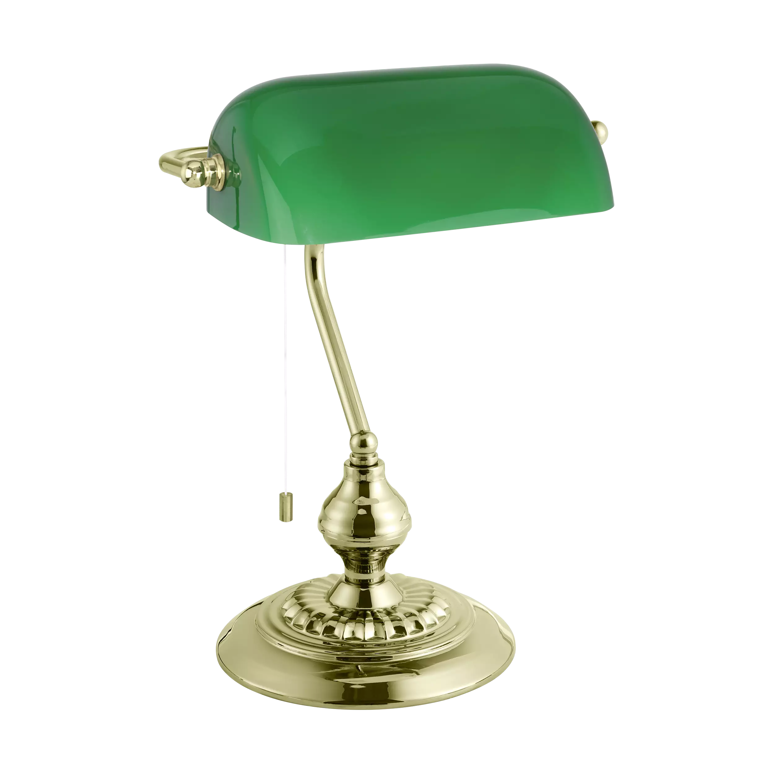 Perinteinen pankkiirivalaisin, myös amerikkavalaisimeksi kutsuttu, valaisee hyvin työpöydän. Vihreälasisessa valaisimessa on kullanvärinen metallijalka ja valkoisella lasilla oleva valaisin on kromirunkoinen. Valaisimen lasikupua voi kääntää ylös- tai alaspäin. Vetokytkin lampun kannassa. Korkeus 39 cm Leveys 27,5 cm 1 x E27 max 60W, ei sisällä valonlähdettä.