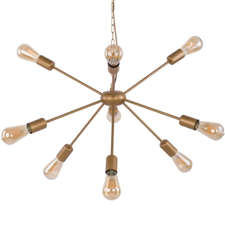 Moderni riippuvalaisin, joka sopii sekä pöydän päälle tai keskelle huonetta. Lämpimän matta kullan värinen metallirunko. Valaisimen ulkonäköön voi vaikuttaa erilaisilla polttimoilla. Ketjun pituutta voi säätää. Koukku- ja pistotulppakiinnitys, pistotulppa ei sisälly. Halkaisija 77 cm Valaisinosan korkeus 40 cm Korkeus max 150 cm 9 x E27 max 60W, ei sisälly.