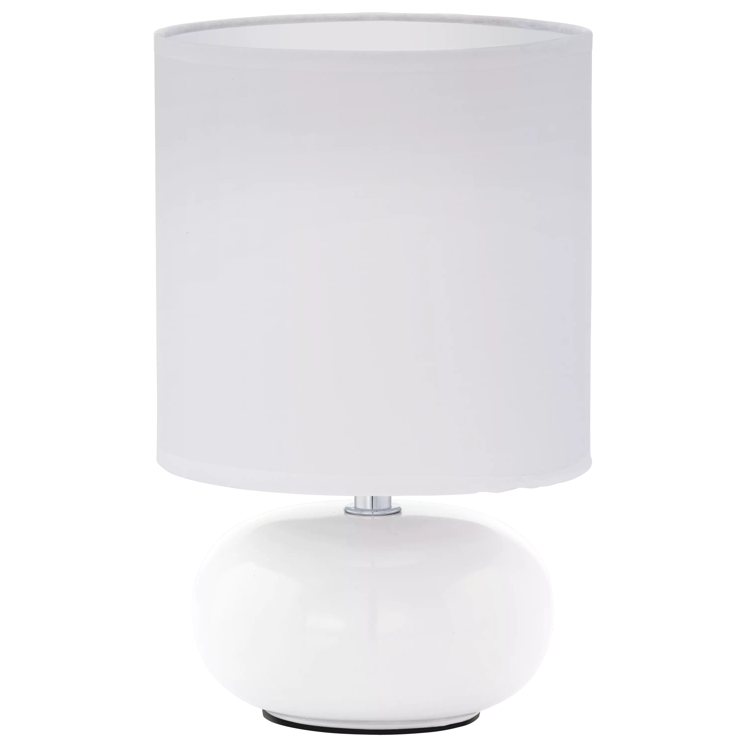 Keraaminen, valkoinen jalka ja kangaspintainen, valkoinen varjostin.