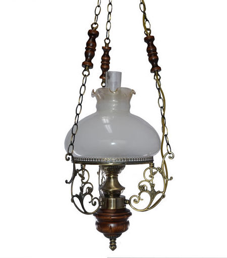 Vanhan öljylampun näköinen koristeellinen riippuvalaisin. Antiikkimessingin väriset metalliosat, tummaa puuta puuosat, matta lasi kellertävällä reunuksella. Lasin halkaisija24,5cm 1xE27 Max 60W (ei sisälly), kaikki lampputyypit käyvät tähän valaisimeen. Helppo koukku- ja pistotulppakiinnitys (pistotulppa ei sisälly).