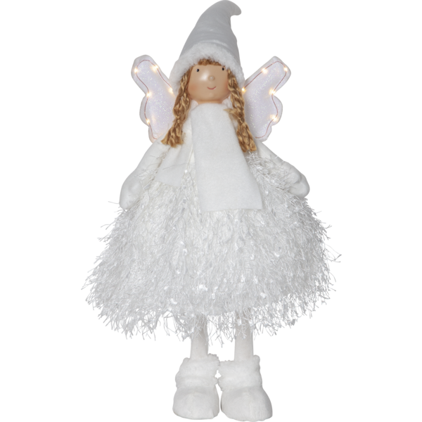 Nova koriste-enkelin siivissä hehkuu lämmin sävyiset ledit. Lämmintä tunnelmaa tuova koristehahmo on paristokäyttöinen ja tarkoitettu sisäkäyttöön. Harmaa asuste ja valkoinen kaulahuivi....