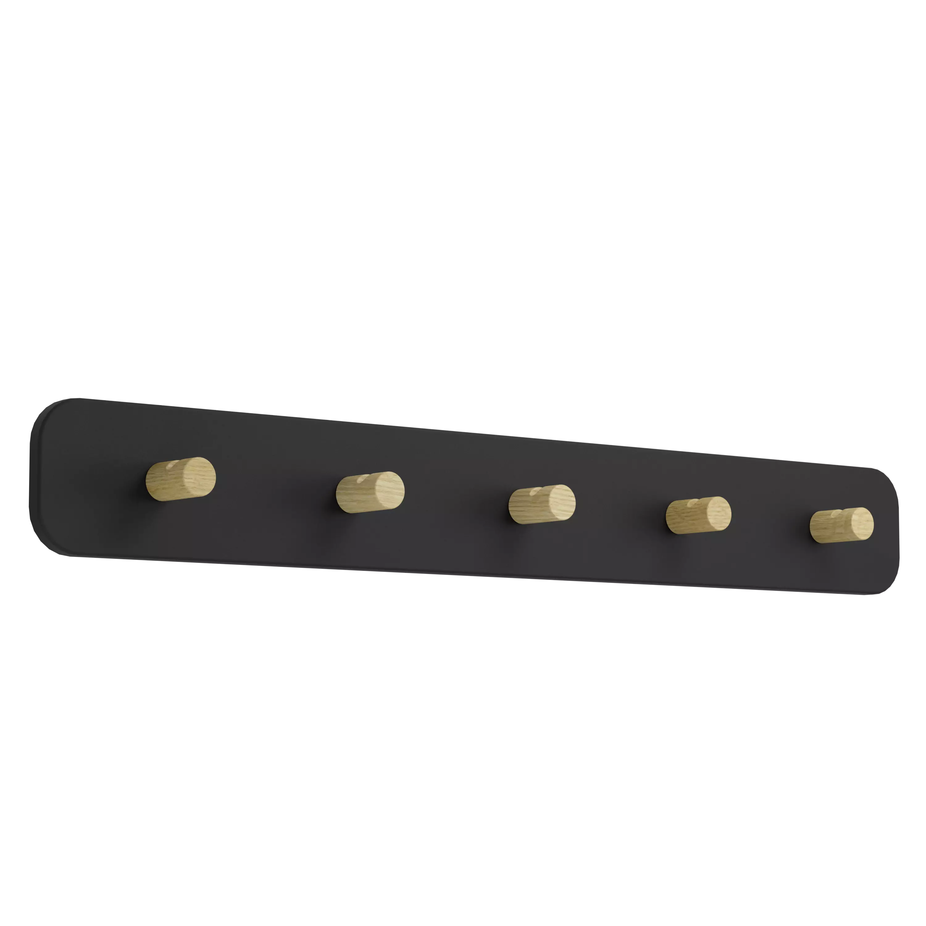 Musta metallirunko ja puunväriseksi maalatut, metalliset naulakon ripustimet.