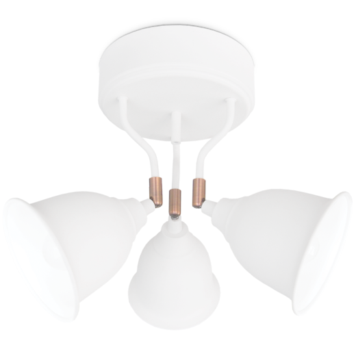 Tyylikäs 3-osainen kohdevalaisin, joka tuo lisävaloa tilaan tai sillä voi tarvittaessa korostaa kohdetta, joka tulee valaistuna paremmin esille. Valkoinen metallirunko ja näköä antavat kuparinväriset nivelet. Valaisin on helppo asentaa koukkuun ja pistokkeeseen. Kattoon tulevan osan halkaisija 20cm Kupujen halkaisija 14cm Katosta etäisyys noin 35cm 3xE14 max 40W, ei sisällä, kaikki lampputyypit käyvät tähän valaisimeen.