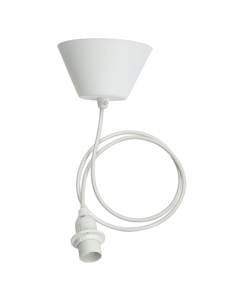 Valkoinen ripustusjohto, jossa on iso, peittävä kattokuppi. Johdossa E14 kanta ja kannassa ulkokierre, johon saa tarvittaessa varjostimen kiinni. Pituus 1,2 m Johdossa on sokeripalaliitos, yhteensopivista tuotteista voi ostaa valaisinpistotulpan.