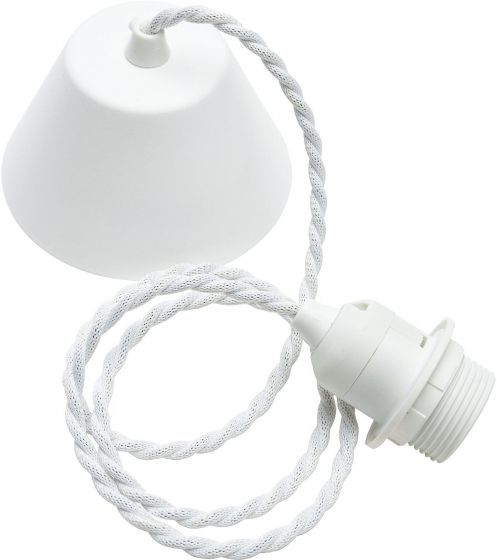 Vanhan ajan henkinen, kangaspintainen, kierretty ripustusjohtosetti valkoisena. 1,2m mittainen johto ja E27 kanta, johon voi kiinnittää varjostimen. Kattokuppi, sokeripala ja ripustuskoukku, valaisinpistotulppa ei sisälly.