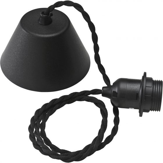 Vanhan ajan henkinen, kangaspintainen, kierretty ripustusjohtosetti mustana. 1,2m mittainen johto ja E27 kanta, johon voi kiinnittää varjostimen. Kattokuppi, sokeripala ja ripustuskoukku, valaisinpistotulppa ei sisälly.