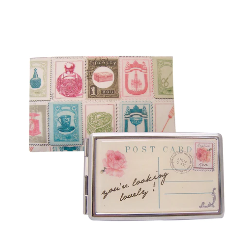 Vintagea huokuva kaunis postikorttikuvioinen peili pahvisessa kotelossa.