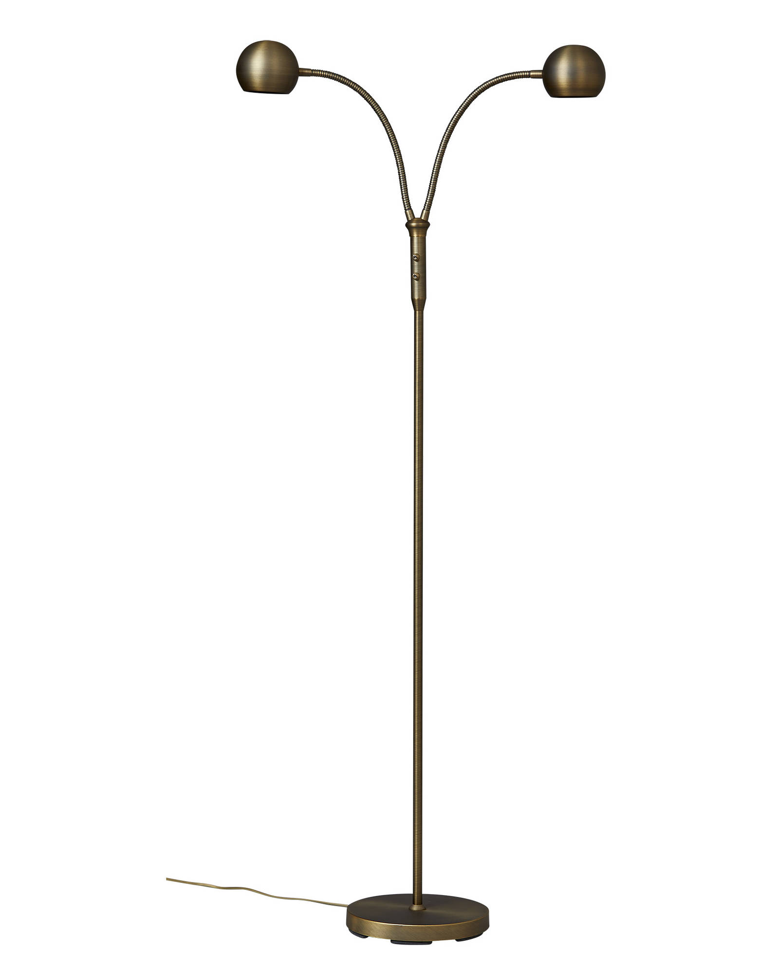 Retrohenkeä tuova 2-osainen Fladen lattiavalaisin käy tehokkaaksi apuvaloksi lukunurkkaukseen. Antiikkimessinginvärinen metallirunko. Taipuisat varret mahdollistavat valon suuntaamisen haluttuun kohtaan. Katkaisija molemmille valoille on kätevästi rungossa. 2 x GU10 max 35W, ei sisälly. Jalustan halkaisija 23 cm Korkeus 140 cm