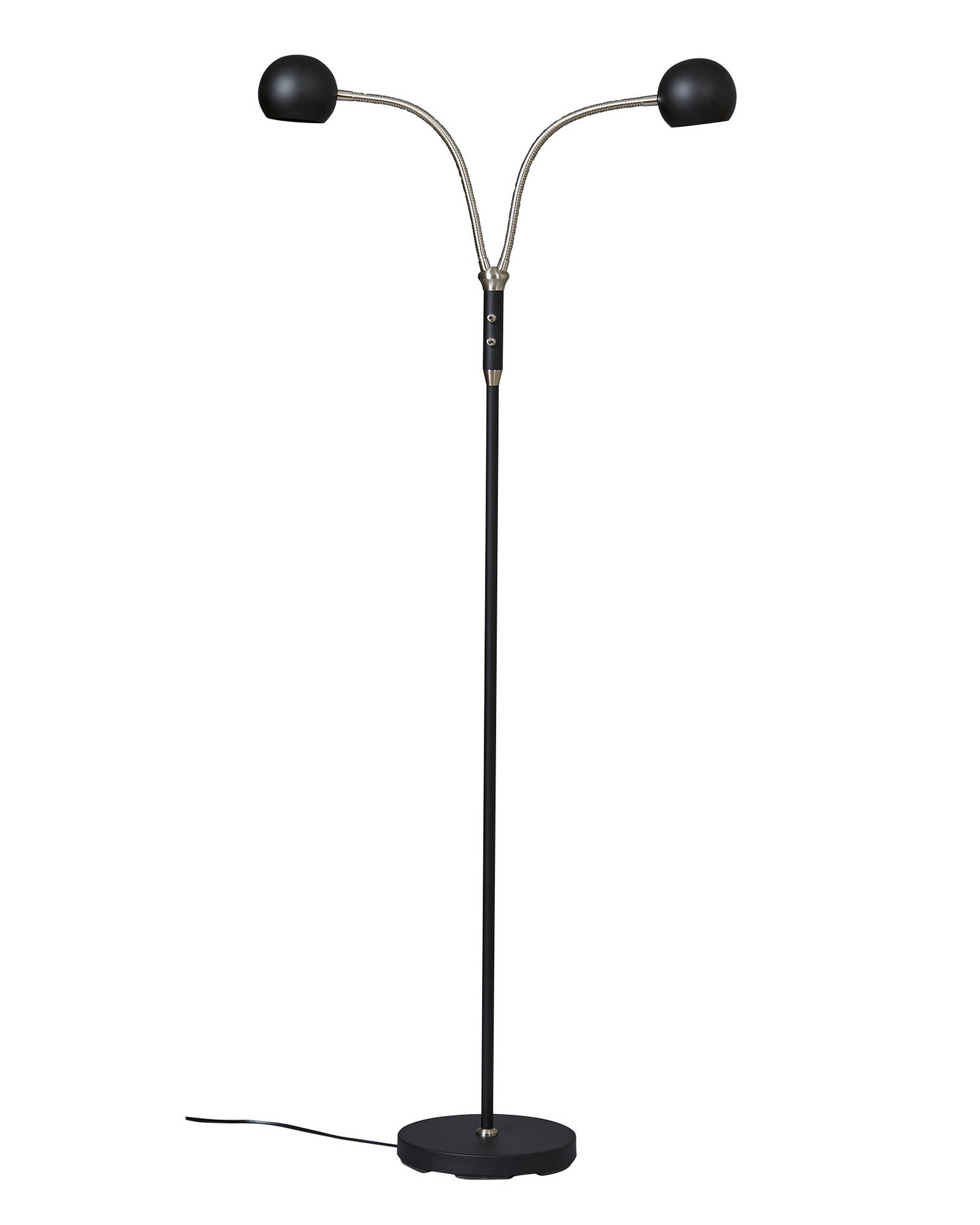 Retrohenkeä tuova 2-osainen Fladen lattiavalaisin käy tehokkaaksi apuvaloksi lukunurkkaukseen. Musta metallirunko. Harjatun teräksen väriset taipuisat varret mahdollistavat valon suuntaamisen haluttuun kohtaan. Katkaisija molemmille valoille on kätevästi rungossa. 2 x GU10 max 35W, ei sisälly. Jalustan halkaisija 23 cm Korkeus 140 cm