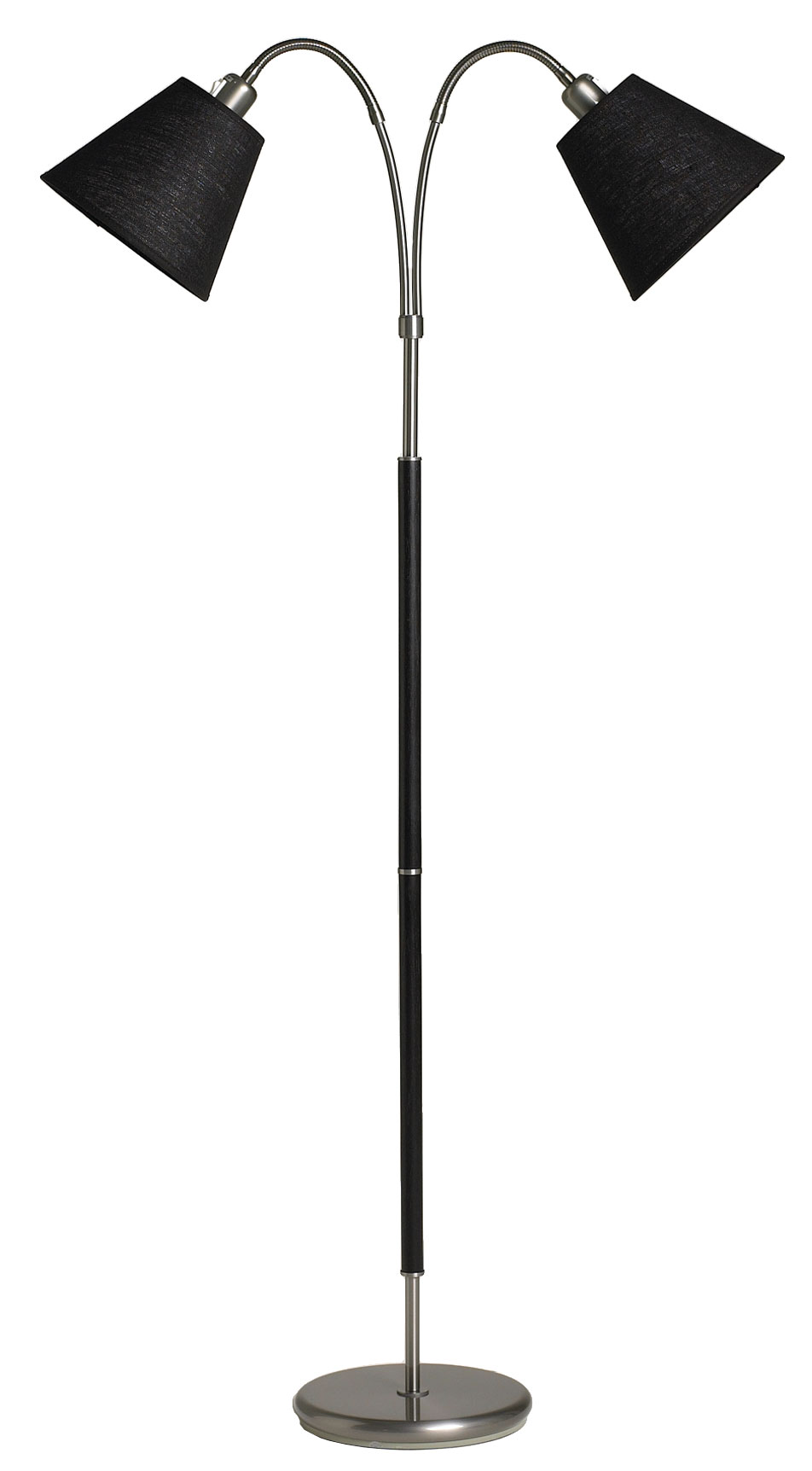 2-osainen suunnattava, Ruotsissa valmistettu laadukas lattiavalaisimen runko ilman varjostimia. Musta metallinen runko. 2 x E27 max 75W, ei sisälly. Kippimalliset, E27 kantaan kiinnityksellä olevat varjostimet käyvät tähän valaisimeen ja on ostettava erikseen. Korkeus 150 cm Leveys 70 cm Katkaisijat ovat ylhäällä lampunkannassa.