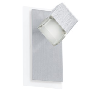 Moderni Led-seinävalaisin. Valo-osaa voi kääntää eri suuntiin. Akryyli hajoittaa led-valon leveälle, joten ei ole pistemäinen valo. Valkoinen ja alumiinin värinen, matta akryyli. 1x4,76W led, sisältyy, 218 lumen. Kiinteä asennus, katkaisija rungossa. Ei himmennettävä. Korkeus 16cm Leveys 9cm