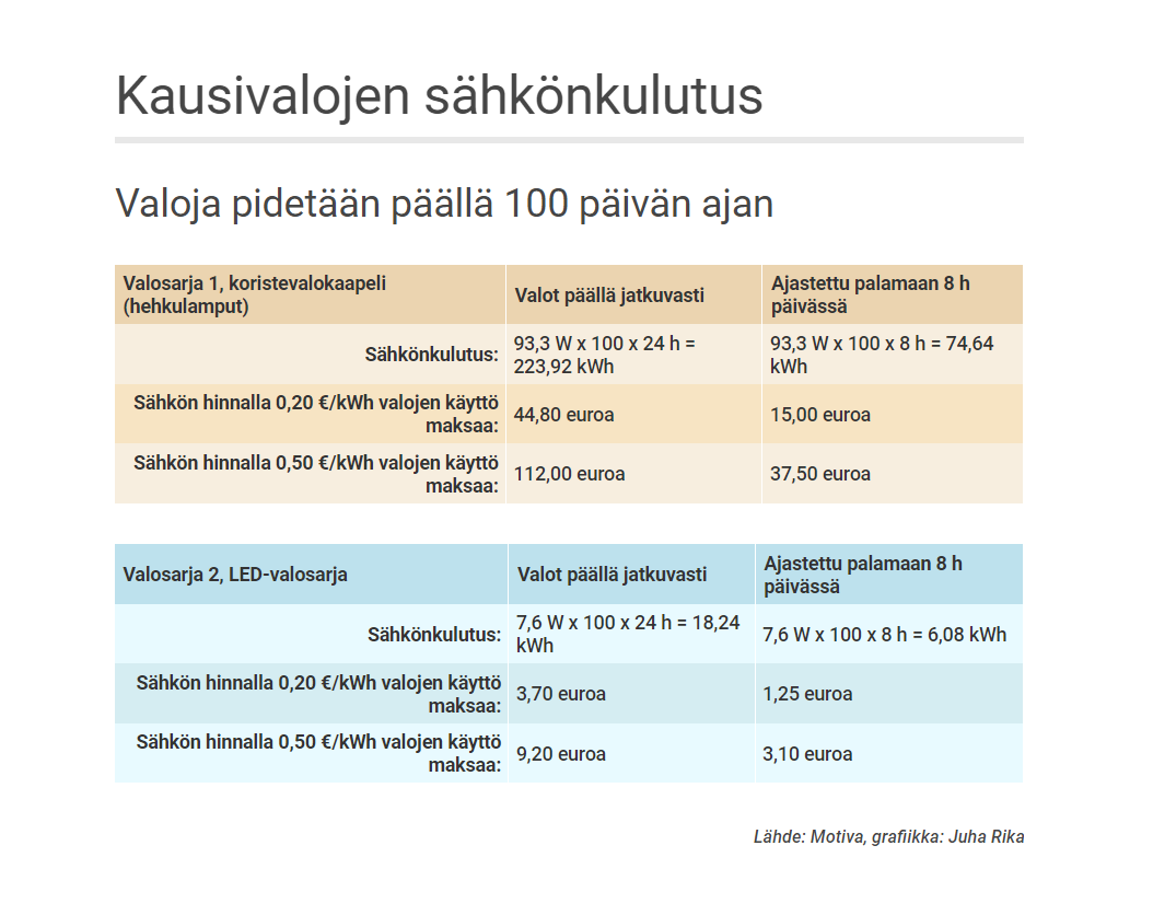 – Sähkönkulutus parilla kausivalosarjalla on karkeasti arvioituna vain yksi kymmenesosa siitä, mitä televisio vie, korkeintaan yksi viidesosa television tuntikulutuksesta. Oleellista on jälleen, että valot ovat ledejä.