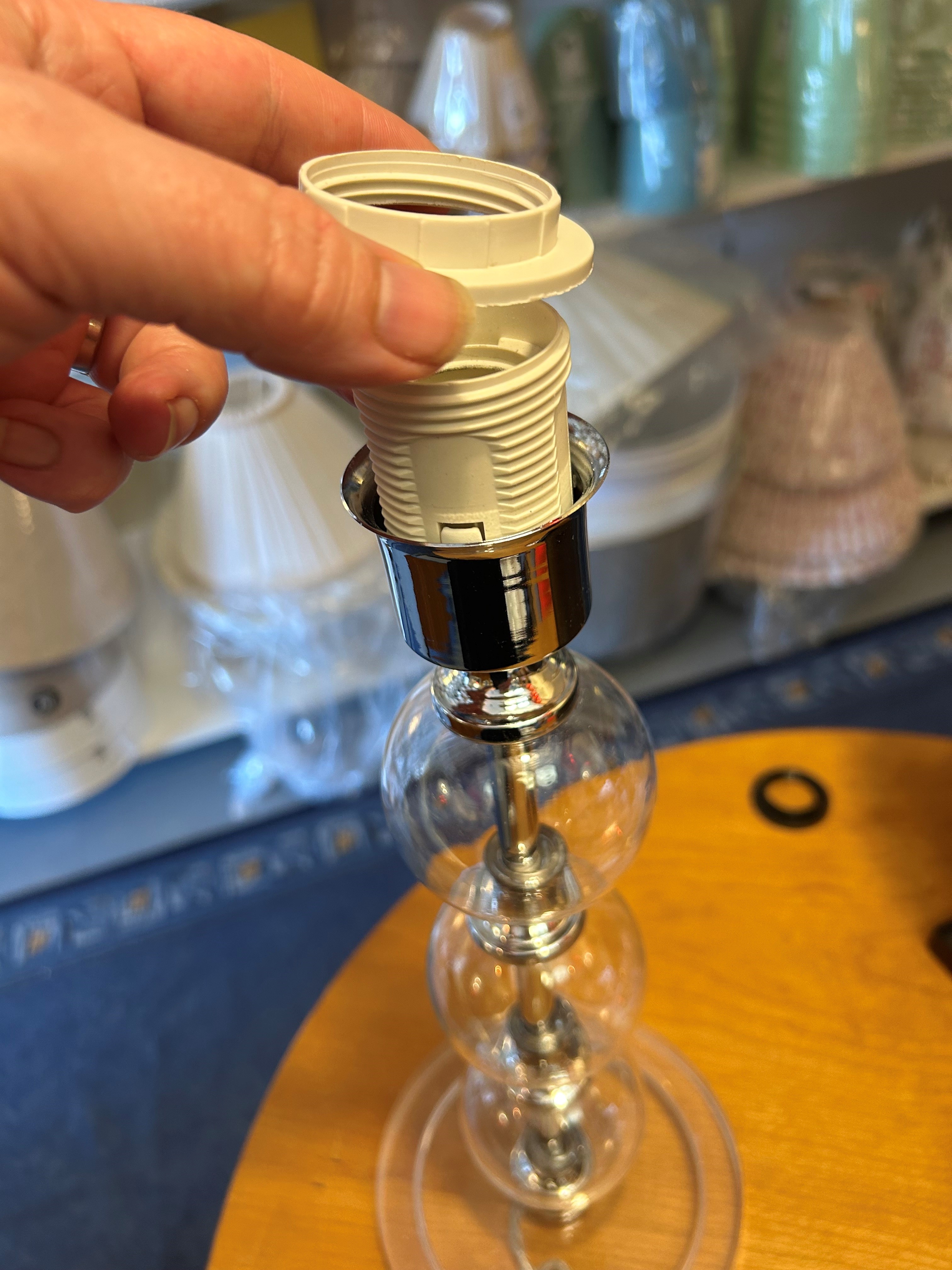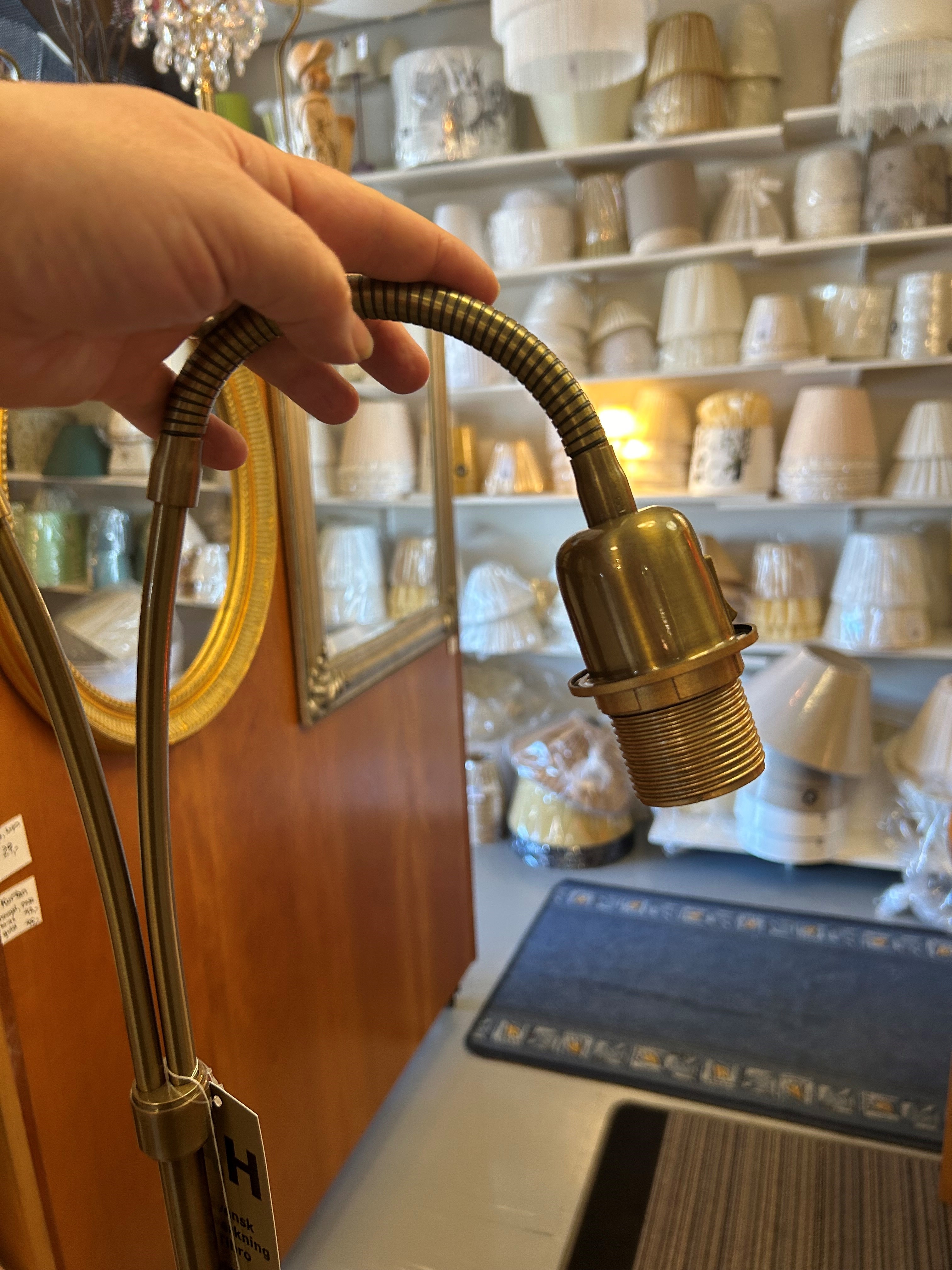 Yllä olevassa kuvassa on vanhan mallinen kanta, jossa on ura vieressä olevalle varjostintelineelle. Kuvassa oleva varjostinteline kiristetään lampun kannassa olevaan uraan. Varjostintelineen koko valitaan varjostimen korkeuden mukaan ja varjostimessa on yläosassa noin 10mm reikä, johon varjostinteline kiinnitetään. Varjostintelineen ylhäällä on nuppi, joka kierretään irti, varjostin asetetaan telineen päälle ja lopuksi nuppi kierretään takaisin varjostintelineeseen kiinni, jolloin varjostin jää tukevasti telineeseen kiinni. Meidän varjostintoimittajilta VarjoMarjalta sekä Ateljee Sinun Varjosi saa monipuolisesti eri kokoisia ja kankaisia varjostinvaihtoehtoja varjostintelinekiinnitykseen. Sama kiinnitys on myös esimerkiksi useampi lamppuisissa lattiavalaisimissa, joissa lampun kantojen yläpuolella on pystyssä 10mm kierretanko, johon varjostin kiinnitetään. Kysy myymälästämme lisätietoa ja koko vaihtoehtoja.