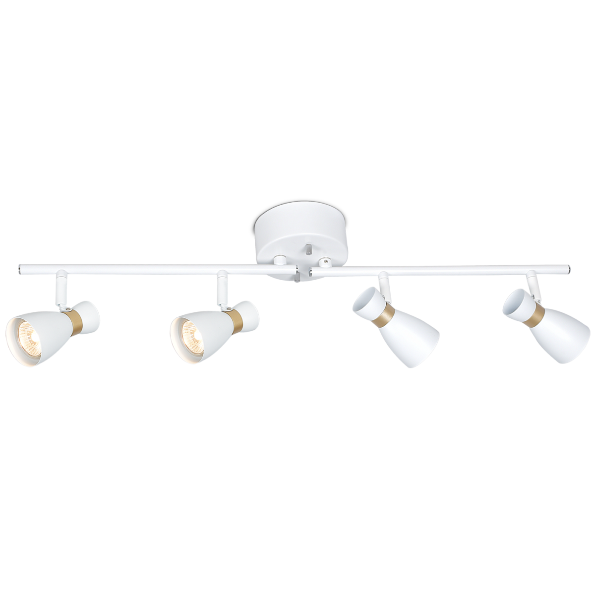 Elegantti 4-osainen kattospottivalaisin Zion antaa tyylikkään kohdemaisen valon. Valkoinen metallirunko, jonka ulkonäön viimeistelee messingin väriset yksityiskohdat. Kohdevalaisin antaa hyvän valon tiloissa, joissa valon pääsee suuntaamaan lähellä olevaan kohteeseen. Kohdevalaisin toimii hyvin käytävämallisissa tiloissa, joissa valaistava pinta on lähellä ja heijastaa valon tasaisesti hyväksi yleisvaloksi. Valaisimen varret käännettävissä ja valo-osat suunnattavissa haluttuun suuntaan. Korkeus 20 cm Pituus 72 cm Koukku- ja pistotulppakiinnitys. 4 x GU10 max 10W, ei sisälly.